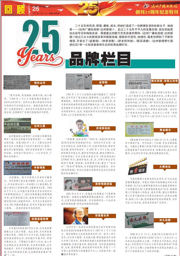 二十五年的風(fēng)雨、輝煌、磨煉、成長(zhǎng),把她打造成了一位婀娜多姿的妙齡女子。她就是——《達(dá)州廣播電視報(bào)(達(dá)州新報(bào))》。走過(guò)二十五年不平凡的發(fā)展歷程,現(xiàn)在的她更加光彩奪目和絢麗多姿。厚載著達(dá)州數(shù)萬(wàn)忠實(shí)讀者的期待,《達(dá)州廣播電視報(bào)(達(dá)州新報(bào))》經(jīng)過(guò)幾次大的新聞改革和報(bào)紙改版,報(bào)紙的可讀性、地域性、服務(wù)性得到了不斷的增強(qiáng),孕育出了《詩(shī)凡話題》等一大批讀者喜聞樂見的優(yōu)秀品牌欄目。