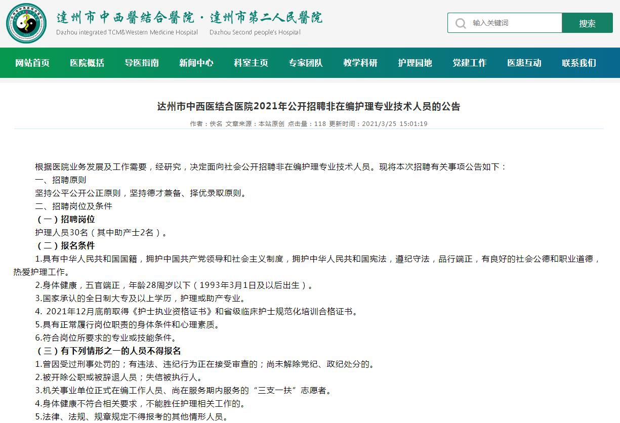 達聘網(wǎng)(www.0818rc.net)達州人才網(wǎng)訊 根據(jù)醫(yī)院業(yè)務發(fā)展及工作需要,經(jīng)研究,決定面向社會公開招聘非在編護理專業(yè)技術人員?,F(xiàn)將本次招聘有關事項公告如下: